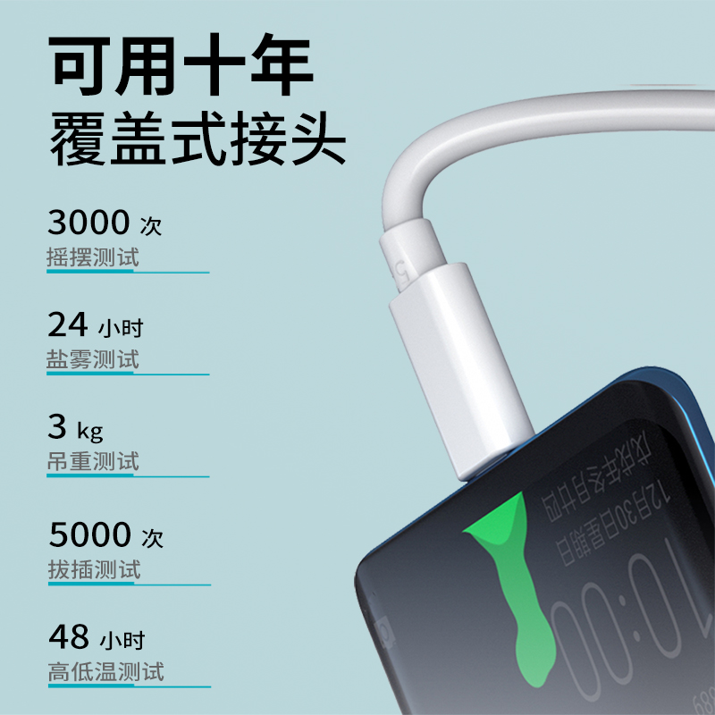 如上图所说,我们的数据线经过了3000次摇摆测试,24小时盐雾测试,3KG吊重测试,5000次拔插测试,48小时高低温测试,从此数据看出,我们对产品质量的追求是有多高。