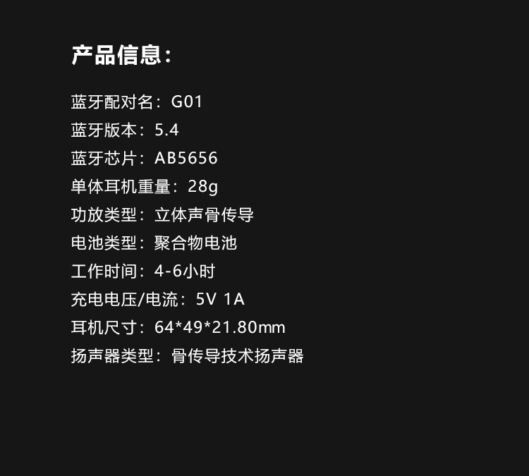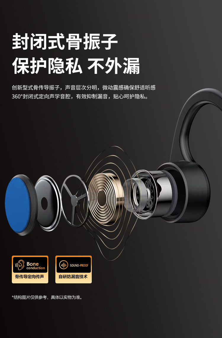 创新型式骨传导振子,声音层次分明,微动震感确保舒适听感360°封闭式定向声学音腔,有效抑制漏音,贴心呵护隐私。